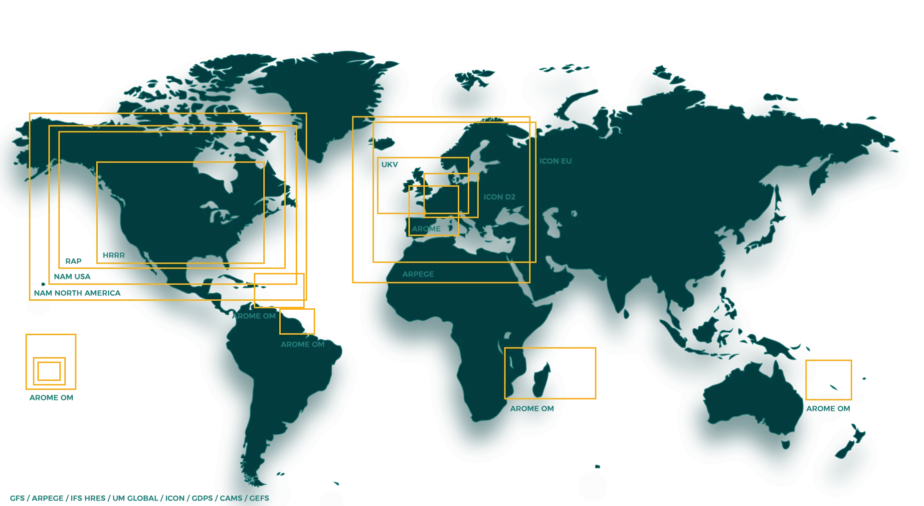 FROGCAST aggregates data from over 20 Numerical Weather Prediction (NWP) models provided by national meteorological agencies worldwide.